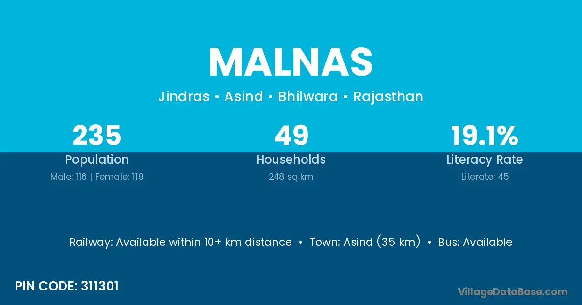 Asind (35 km) is the nearest town to Malnas village for major economic activities and is located approximately 35 km away.