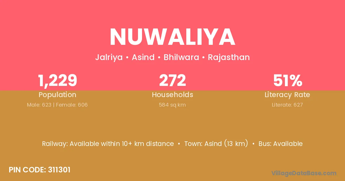 Asind (13 km) is the nearest town to Nuwaliya village for major economic activities and is located approximately 13 km away.