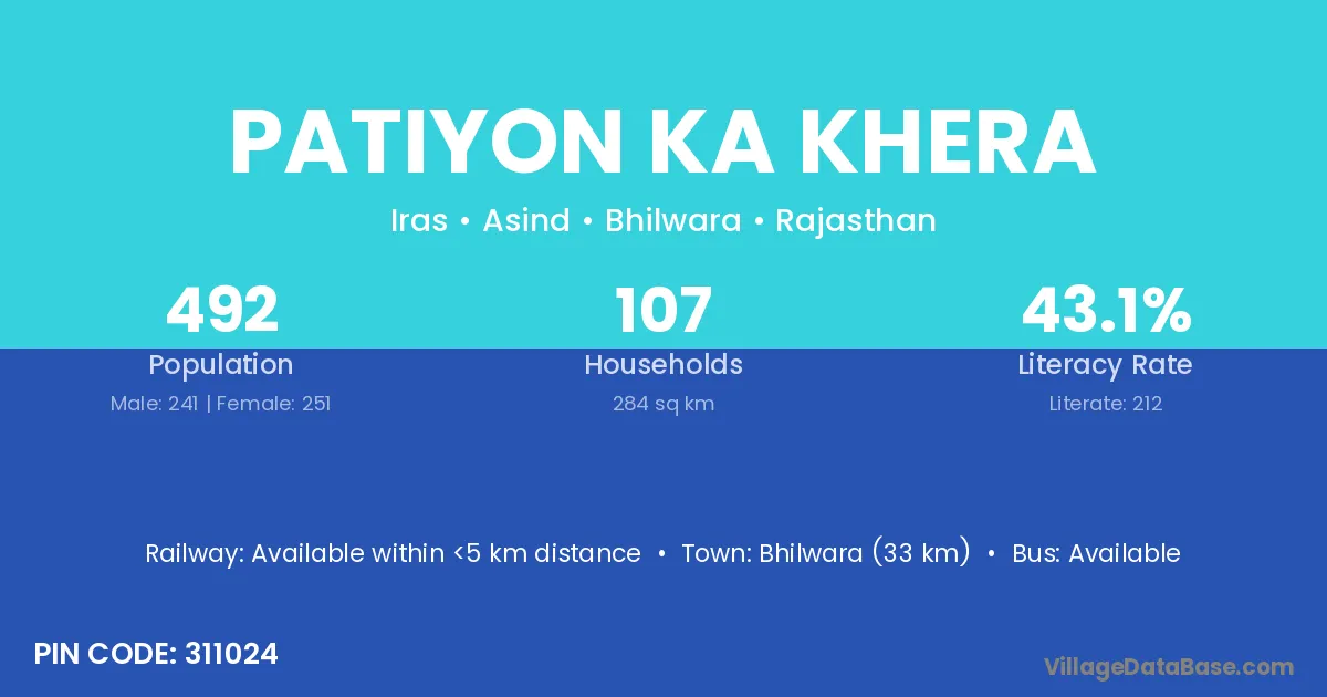 Bhilwara (33 km) is the nearest town to Patiyon Ka Khera village for major economic activities and is located approximately 33 km away.