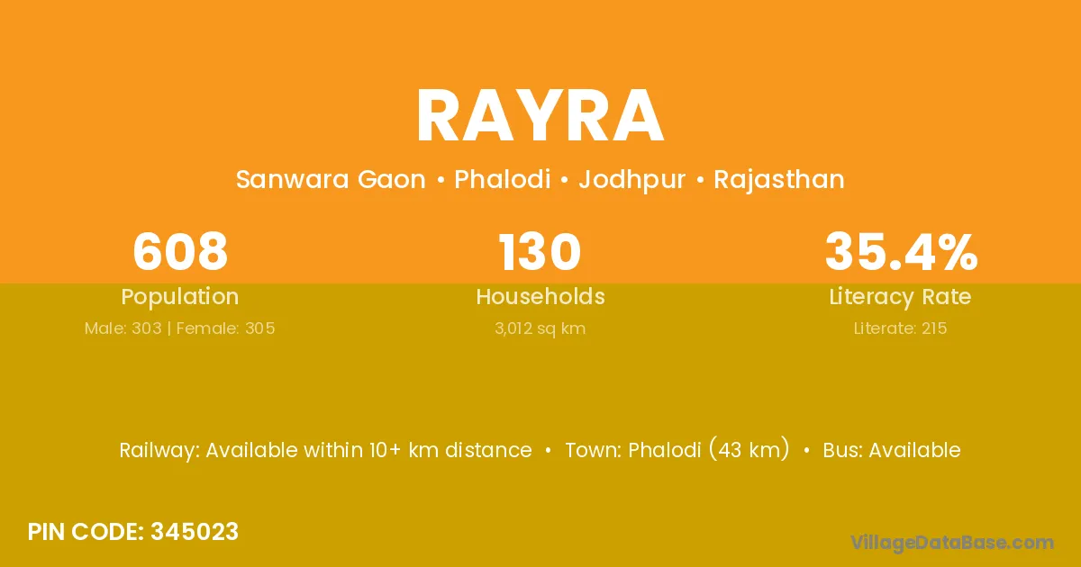 According to Census 2011 information, the village code of Rayra village is 311204.