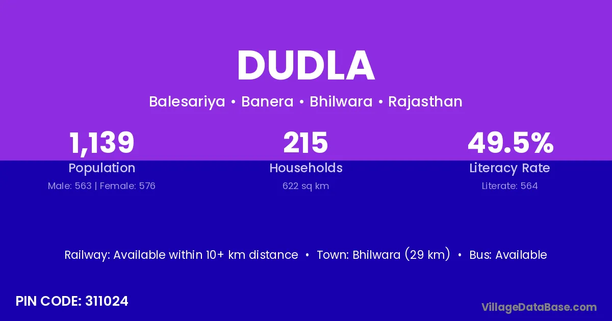 Bhilwara (29 km) is the nearest town to Dudla village for major economic activities and is located approximately 29 km away.