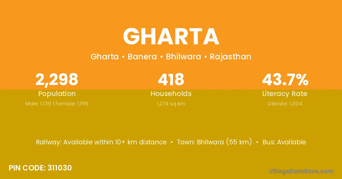 Bhilwara (55 km) is the nearest town to Gharta village for major economic activities and is located approximately 55 km away.