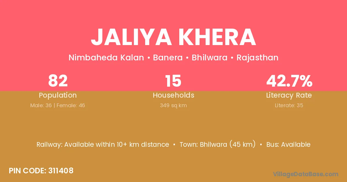 Bhilwara (45 km) is the nearest town to Jaliya Khera village for major economic activities and is located approximately 45 km away.
