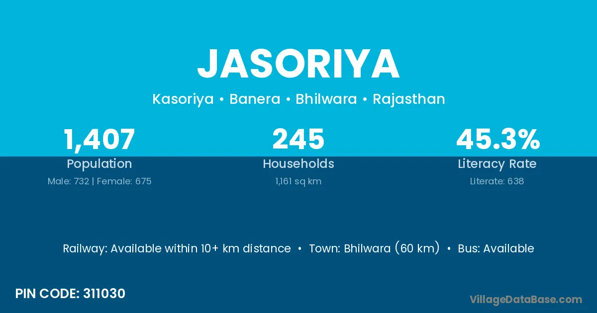 Bhilwara (60 km) is the nearest town to Jasoriya village for major economic activities and is located approximately 60 km away.