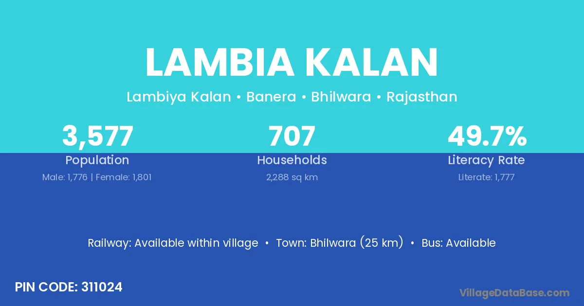 Bhilwara (25 km) is the nearest town to Lambia Kalan village for major economic activities and is located approximately 25 km away.