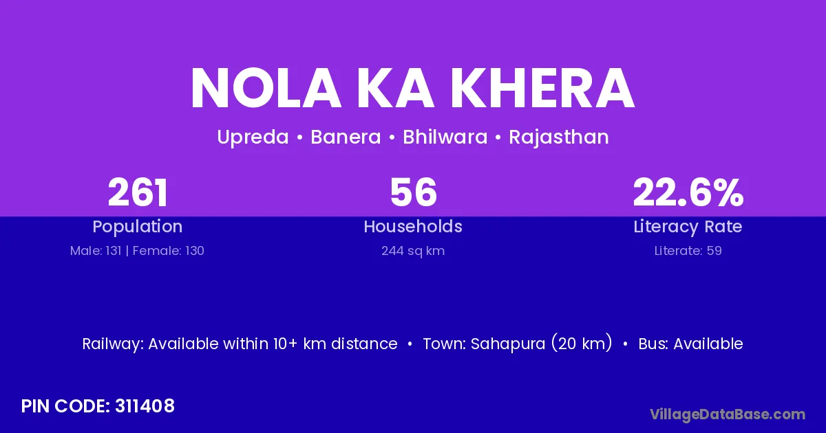 Sahapura (20 km) is the nearest town to Nola Ka Khera village for major economic activities and is located approximately 20 km away.