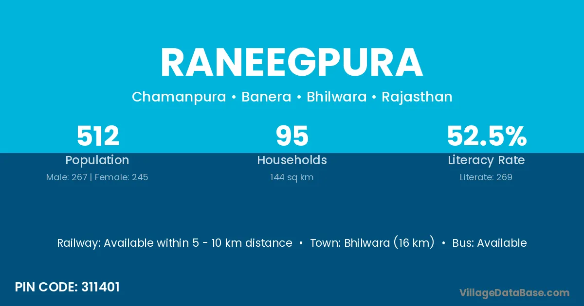 Bhilwara (16 km) is the nearest town to Raneegpura village for major economic activities and is located approximately 16 km away.