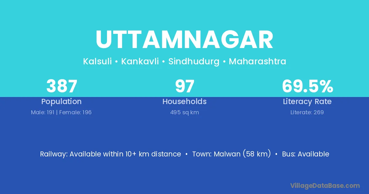 The literacy rate of Uttamnagar village is 51.54%. Male literacy stands at 70.80% and female literacy at 32.46%.