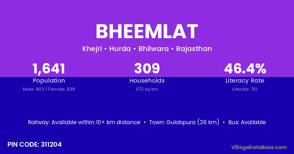 Gulabpura (26 km) is the nearest town to Bheemlat village for major economic activities and is located approximately 26 km away.