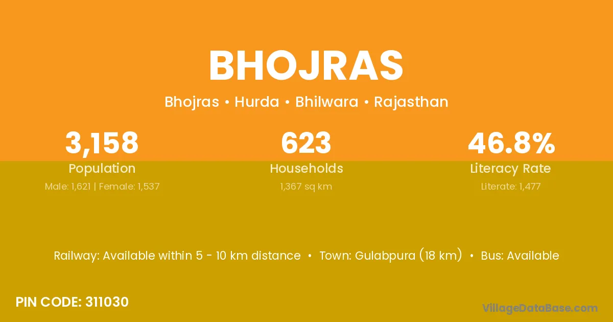 Gulabpura (18 km) is the nearest town to Bhojras village for major economic activities and is located approximately 18 km away.