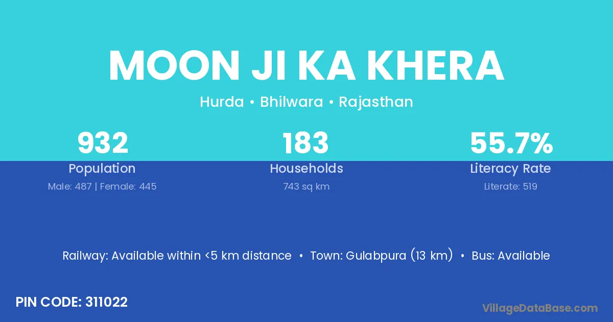 Gulabpura (13 km) is the nearest town to Moon Ji Ka Khera village for major economic activities and is located approximately 13 km away.
