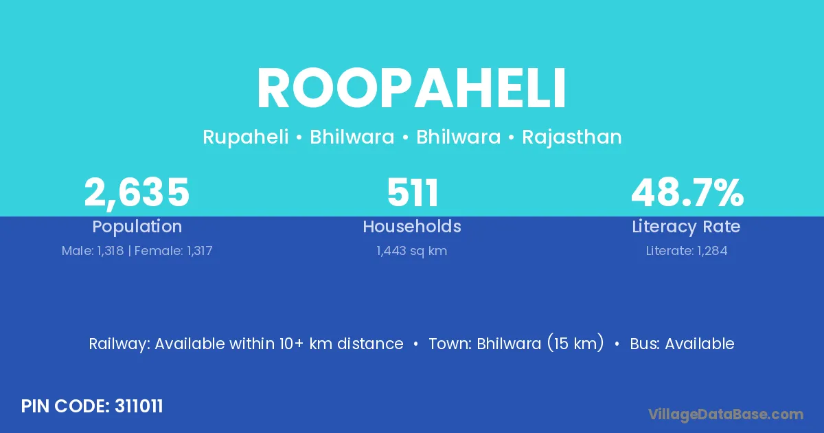 Gulabpura (10 km) is the nearest town to Roopaheli village for major economic activities and is located approximately 10 km away.
