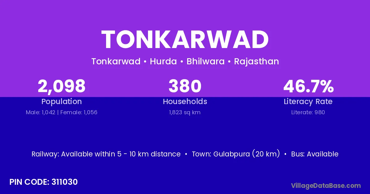 Gulabpura (20 km) is the nearest town to Tonkarwad village for major economic activities and is located approximately 20 km away.