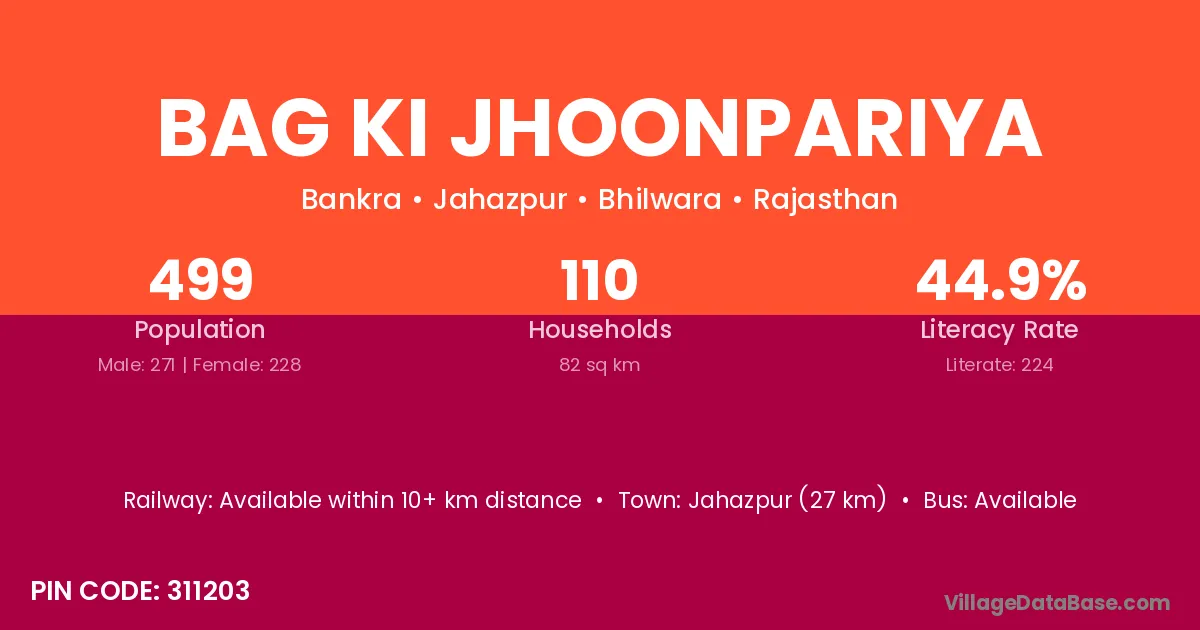 Bag Ki Jhoonpariya village has a total population of 499 people, of which 271 are males and 228 are females.