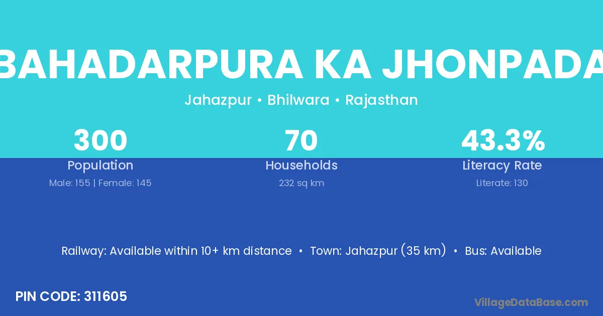 Bahadarpura Ka Jhonpada village has a total population of 300 people, of which 155 are males and 145 are females.