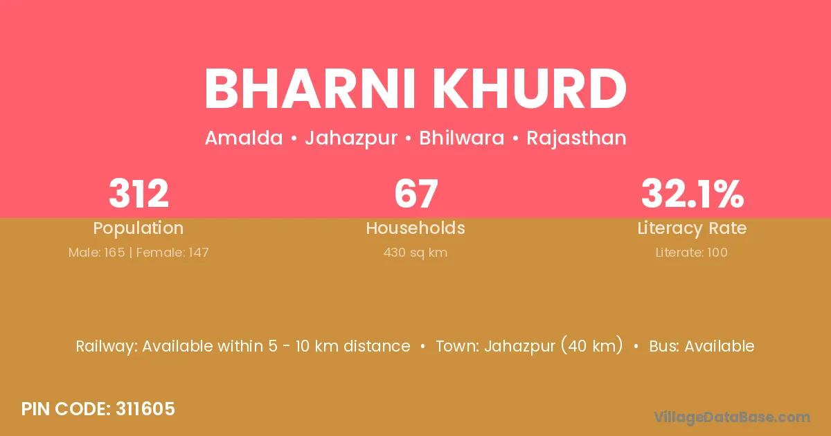 Jahazpur (40 km) is the nearest town to Bharni Khurd village for major economic activities and is located approximately 40 km away.