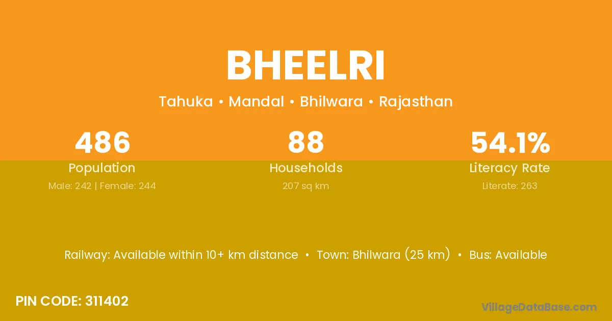 Jahazpur (20 km) is the nearest town to Bheelri village for major economic activities and is located approximately 20 km away.