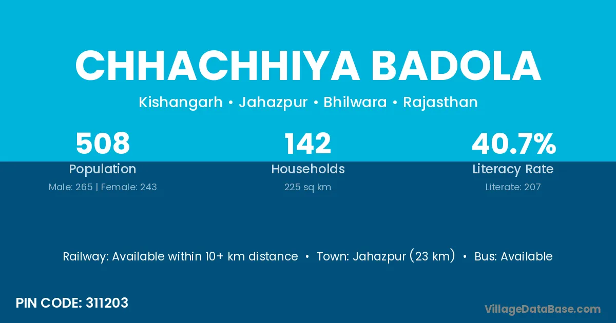 Jahazpur (23 km) is the nearest town to Chhachhiya Badola village for major economic activities and is located approximately 23 km away.