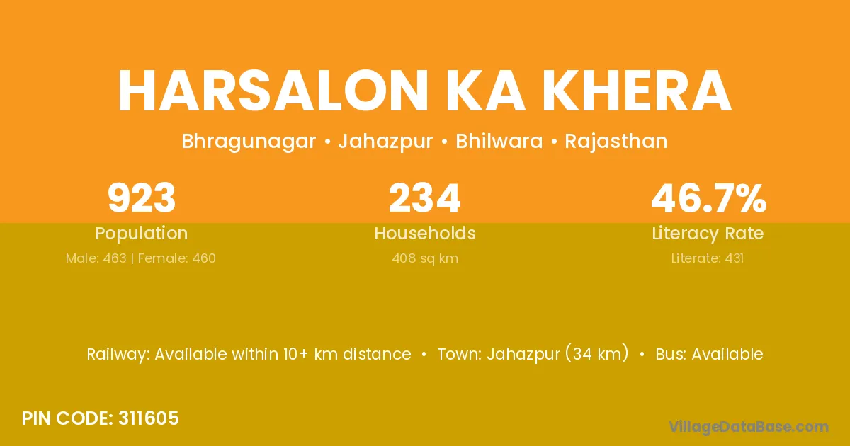 Harsalon Ka Khera village has a total population of 923 people, of which 463 are males and 460 are females.