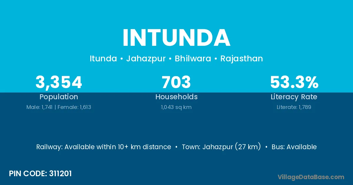 Jahazpur (27 km) is the nearest town to Intunda village for major economic activities and is located approximately 27 km away.