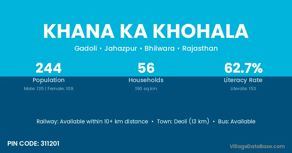 Deoli (13 km) is the nearest town to Khana Ka Khohala village for major economic activities and is located approximately 13 km away.