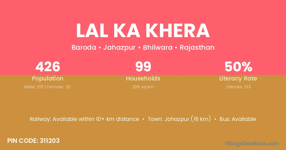 Lal Ka Khera village has a total population of 426 people, of which 215 are males and 211 are females.