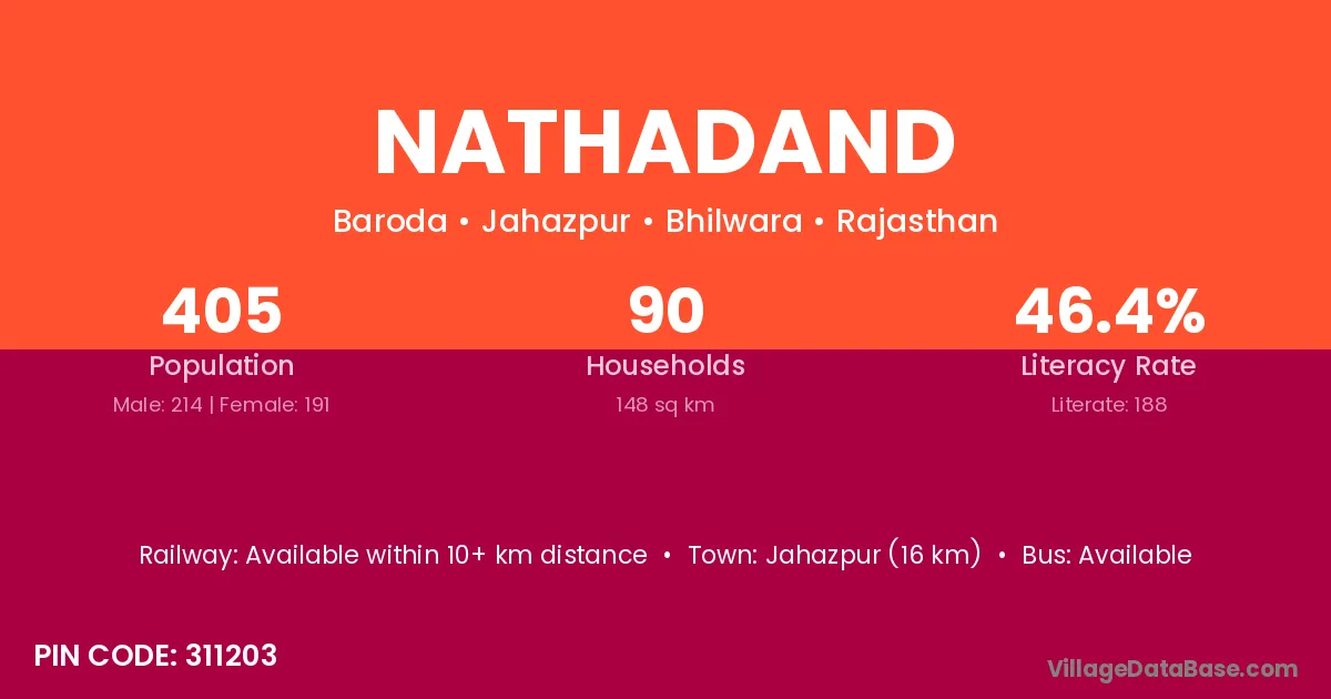 Jahazpur (16 km) is the nearest town to Nathadand village for major economic activities and is located approximately 16 km away.