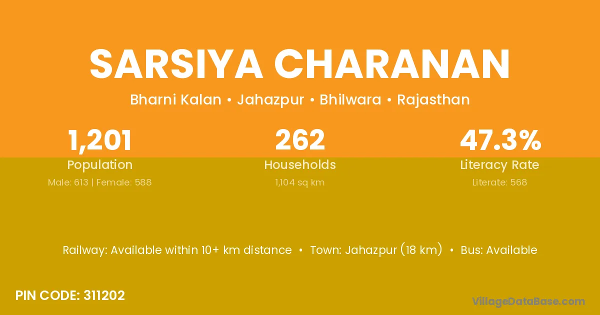 Jahazpur (18 km) is the nearest town to Sarsiya Charanan village for major economic activities and is located approximately 18 km away.