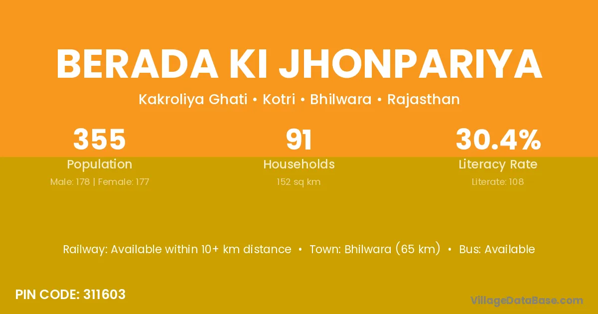 Bhilwara (65 km) is the nearest town to Berada Ki Jhonpariya village for major economic activities and is located approximately 65 km away.