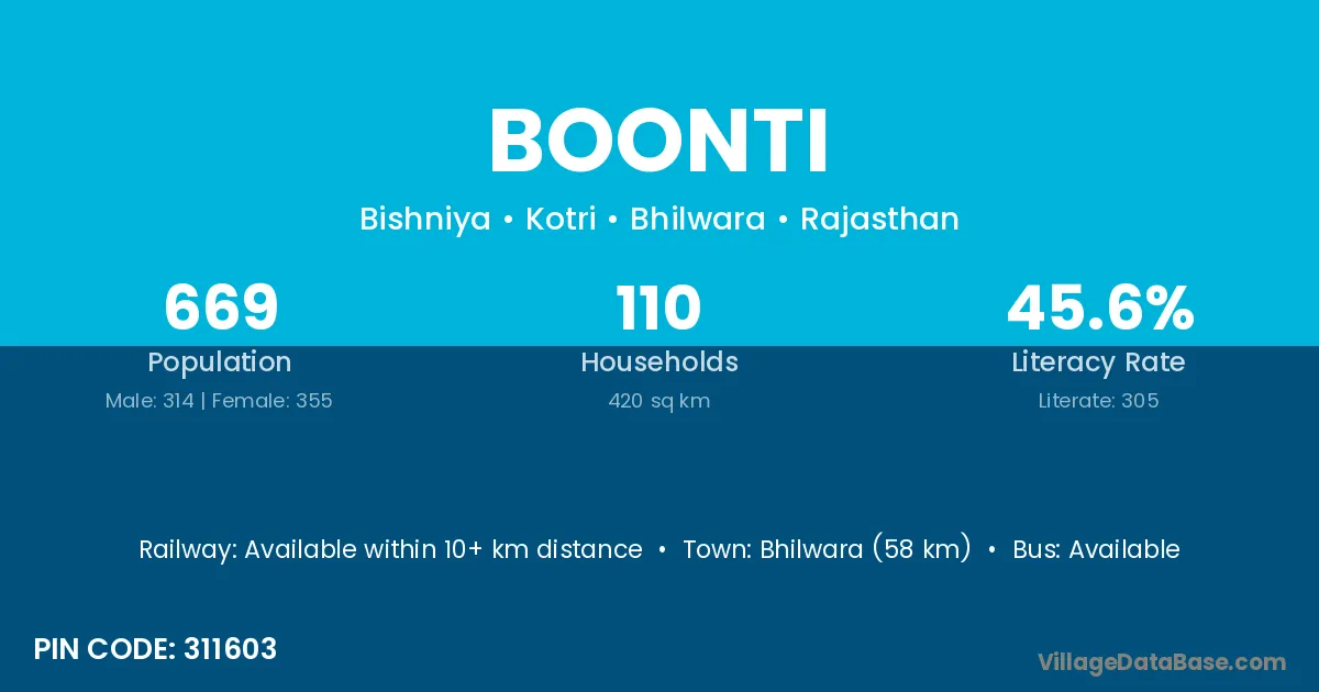 Bhilwara (58 km) is the nearest town to Boonti village for major economic activities and is located approximately 58 km away.
