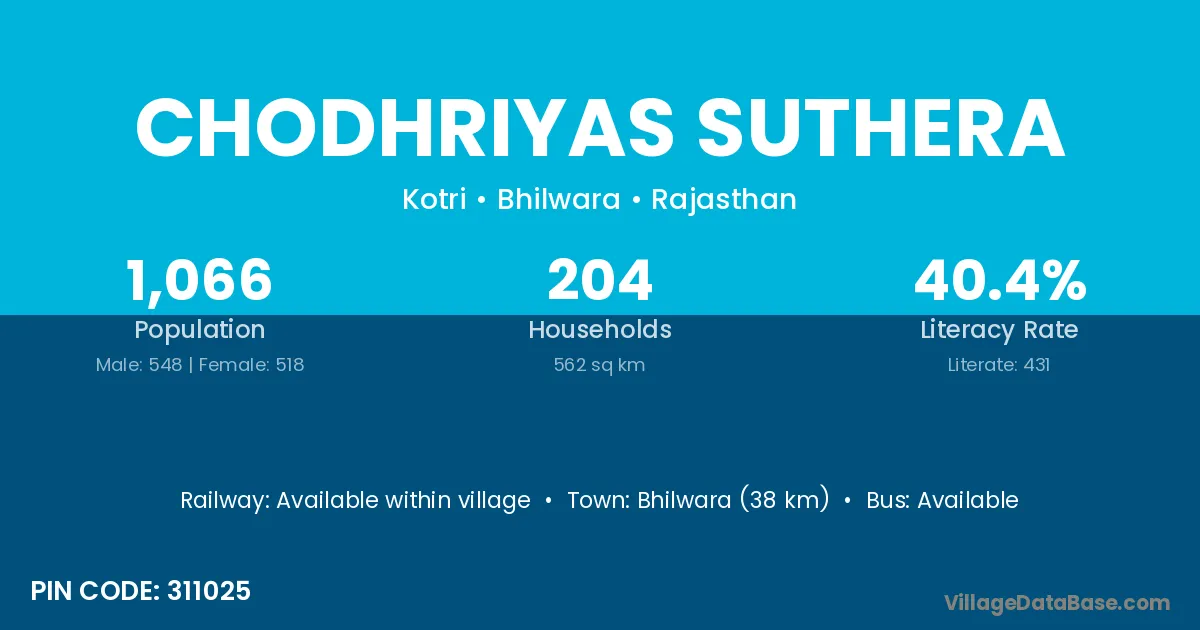 Bhilwara (38 km) is the nearest town to Chodhriyas Suthera village for major economic activities and is located approximately 38 km away.