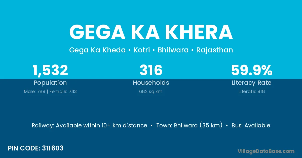 Bhilwara (35 km) is the nearest town to Gega Ka Khera village for major economic activities and is located approximately 35 km away.