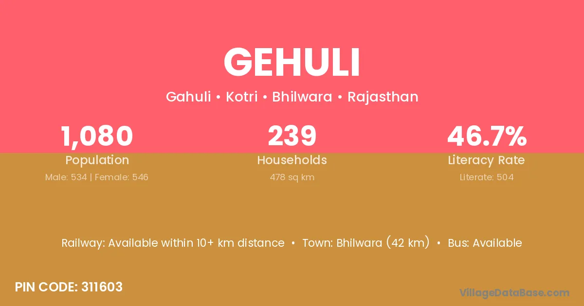 Bhilwara (42 km) is the nearest town to Gehuli village for major economic activities and is located approximately 42 km away.
