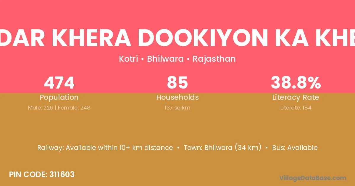 Bhilwara (34 km) is the nearest town to Gudar Khera Dookiyon Ka Khera village for major economic activities and is located approximately 34 km away.