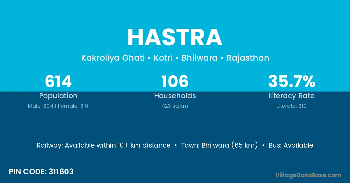 Bhilwara (65 km) is the nearest town to Hastra village for major economic activities and is located approximately 65 km away.