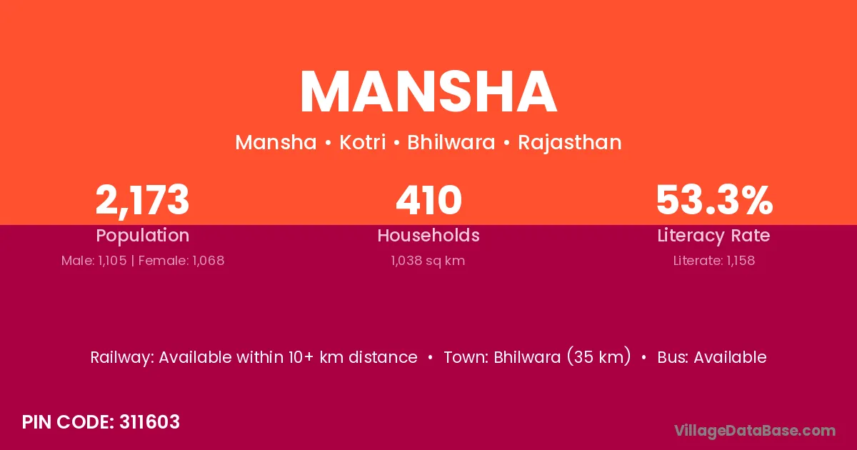Bhilwara (35 km) is the nearest town to Mansha village for major economic activities and is located approximately 35 km away.