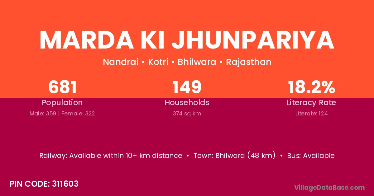 Marda Ki Jhunpariya village has a total population of 681 people, of which 359 are males and 322 are females.