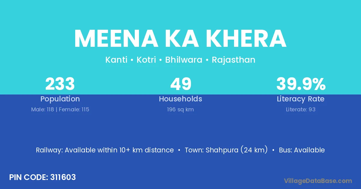 Meena Ka Khera village has a total population of 233 people, of which 118 are males and 115 are females.