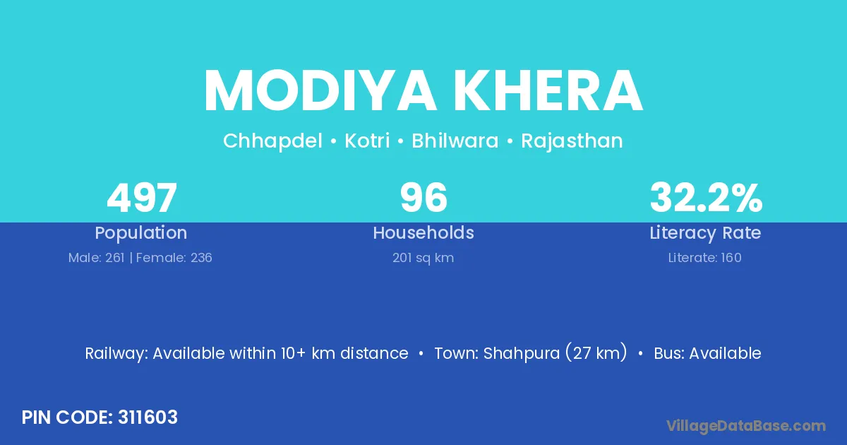Shahpura (27 km) is the nearest town to Modiya Khera village for major economic activities and is located approximately 27 km away.