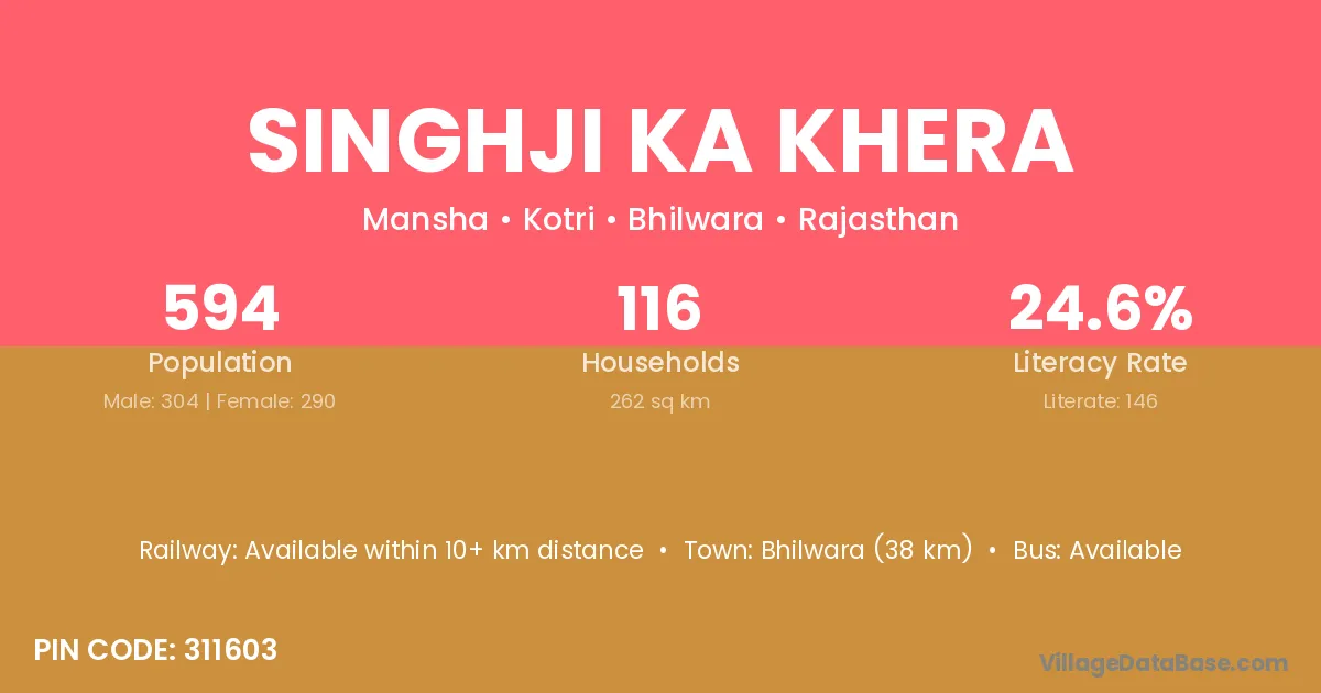 Singhji Ka Khera village has a total population of 594 people, of which 304 are males and 290 are females.
