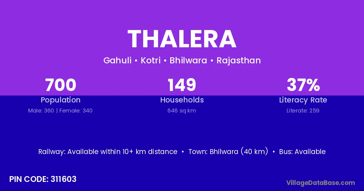 Bhilwara (40 km) is the nearest town to Thalera village for major economic activities and is located approximately 40 km away.