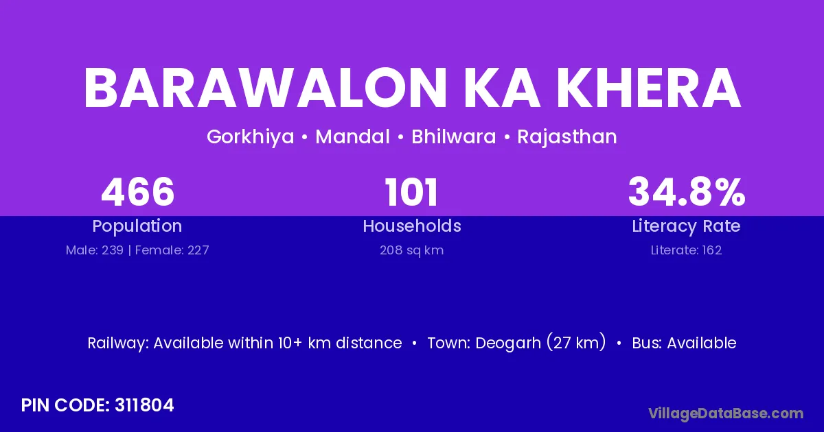 Deogarh (27 km) is the nearest town to Barawalon Ka Khera village for major economic activities and is located approximately 27 km away.