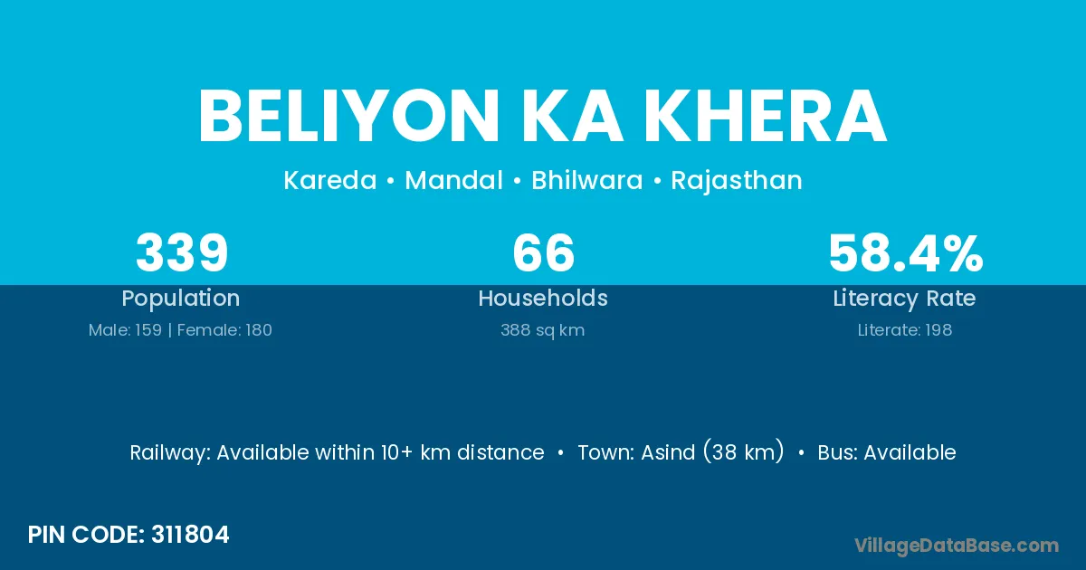 Asind (38 km) is the nearest town to Beliyon Ka Khera village for major economic activities and is located approximately 38 km away.