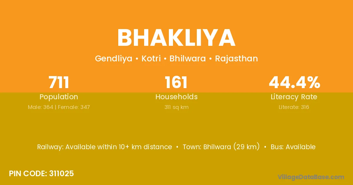 Bhilwara (25 km) is the nearest town to Bhakliya village for major economic activities and is located approximately 25 km away.