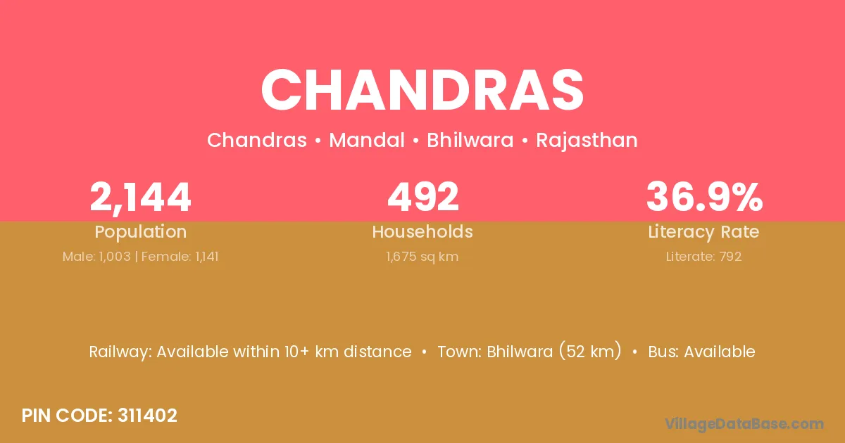 Bhilwara (52 km) is the nearest town to Chandras village for major economic activities and is located approximately 52 km away.