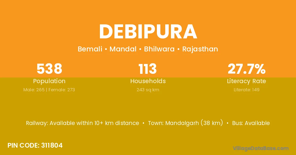 Mandalgarh (38 km) is the nearest town to Debipura village for major economic activities and is located approximately 38 km away.