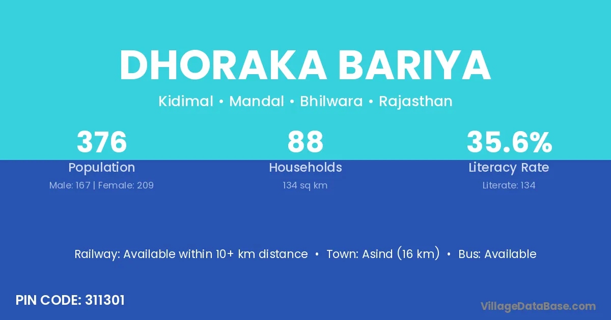 Asind (16 km) is the nearest town to Dhoraka Bariya village for major economic activities and is located approximately 16 km away.
