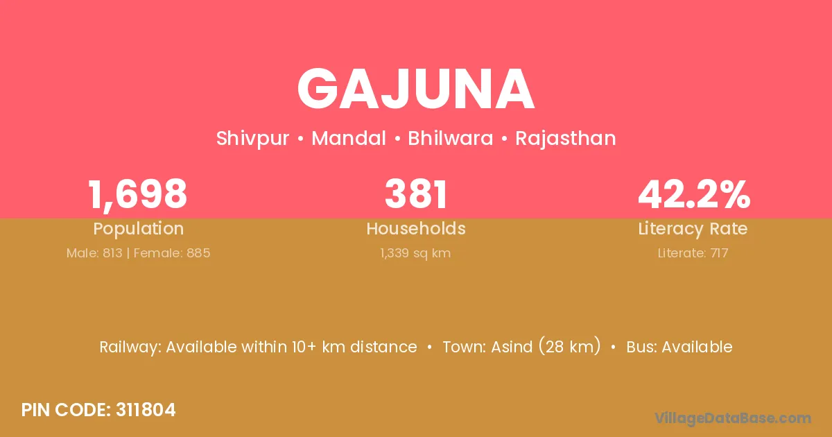 Asind (28 km) is the nearest town to Gajuna village for major economic activities and is located approximately 28 km away.
