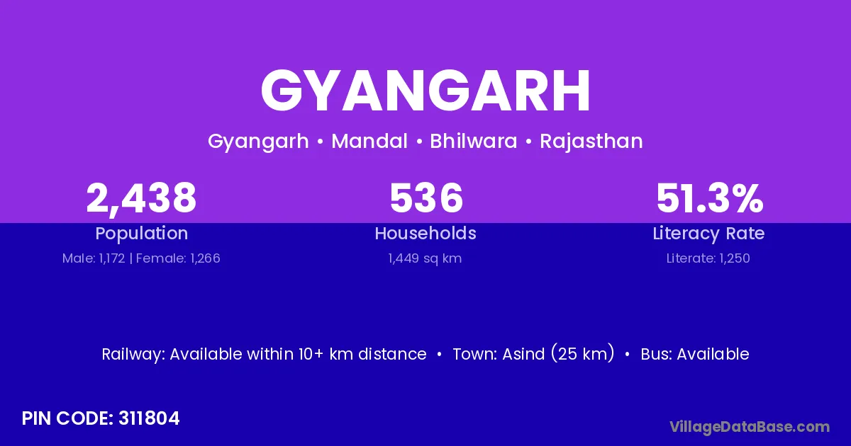 Asind (25 km) is the nearest town to Gyangarh village for major economic activities and is located approximately 25 km away.