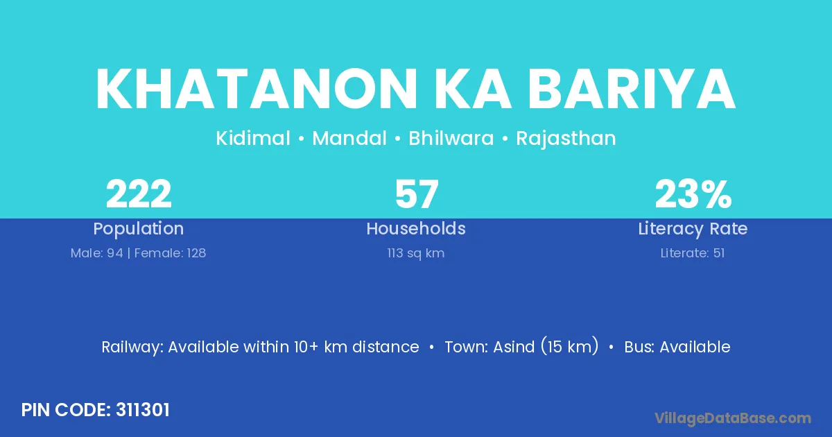 Khatanon Ka Bariya village has a total population of 222 people, of which 94 are males and 128 are females.